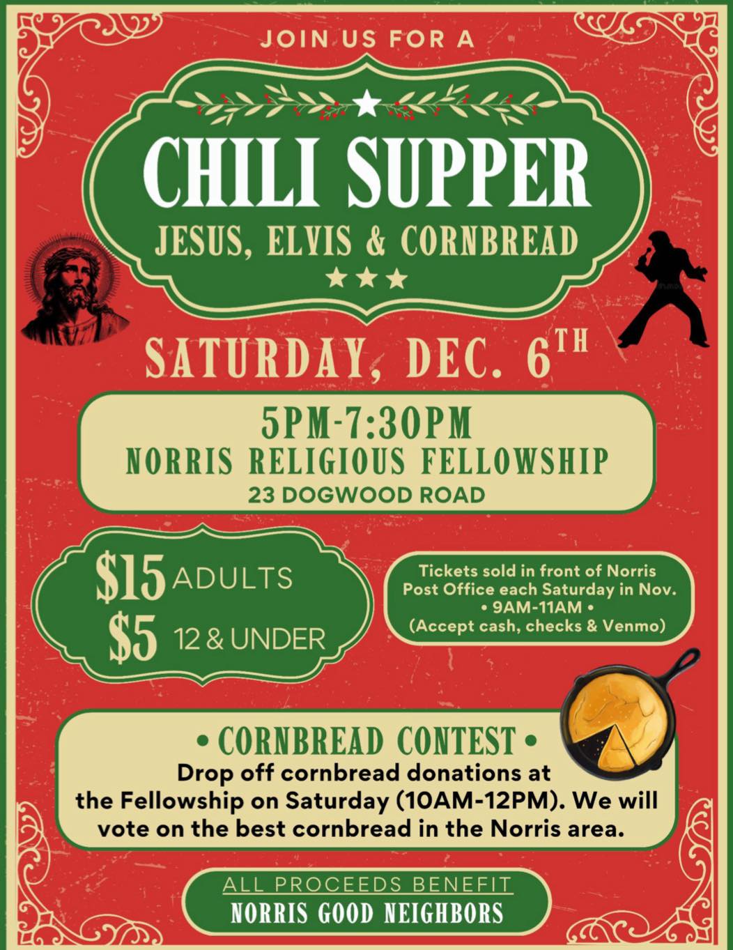 Mark your planners for “Jesus, Elvis, and Cornbread Chili Supper” on Saturday, Dec. 6th